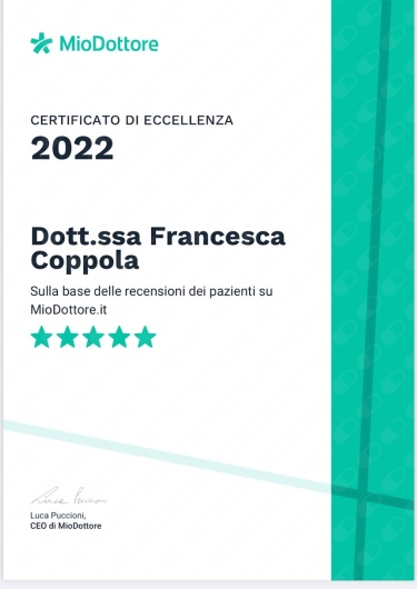 La mia esperienza con il Dott.da Francesca Coppola è assolutamente positiva. Consiglio vivamente , non è facile trovare un professionista con grande qualità umane .
